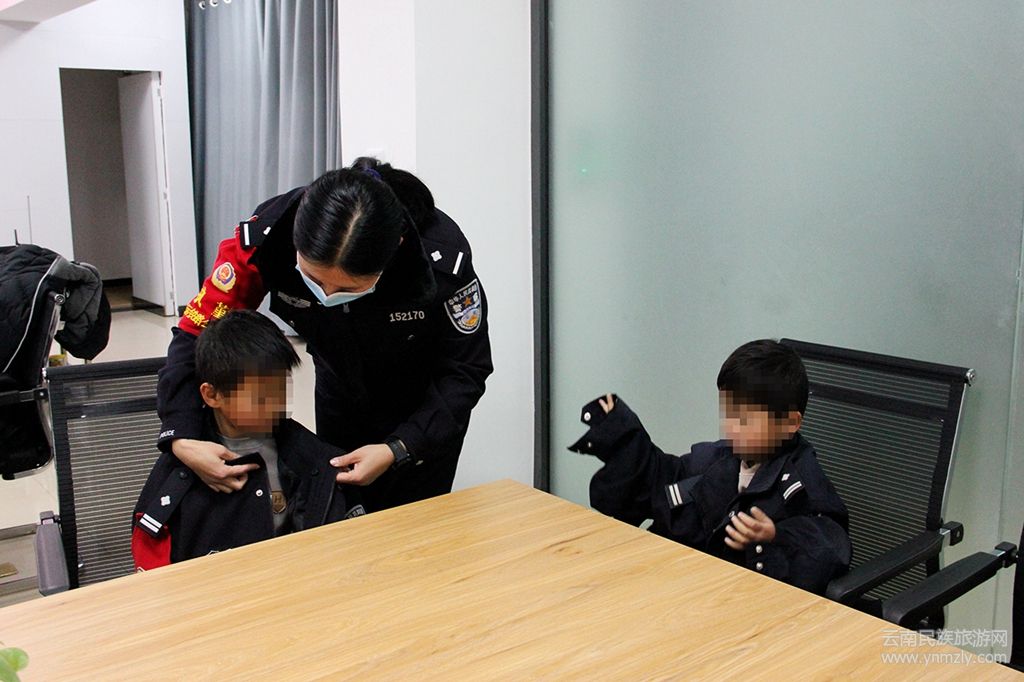 圖為 1月10日,在蒙自火車站,民警為迷路男孩貼心地穿上外套御寒