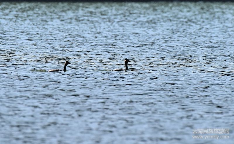 似乎為了證明水庫管理員的話,小船前方不遠處,有兩只“小鴨”在隨波飄蕩。不會是野鴨繁殖了吧?用長焦鏡頭拉近距離,卻發(fā)現(xiàn)它雖然有鴨子一樣扁扁的嘴,但頭是卻戴著黑色的冠。原來是鳳頭鸊鷉,想不到這種在縣城周邊水域拍攝小鸊鷉時常想起的水鳥,竟然會在明山水庫里遇上。只可惜小家伙太好動,正想好好拍攝,卻已潛入水中不知去了何方。