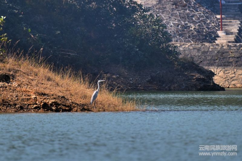 遠遠望去,還有一只蒼鷺在靜立湖邊,如一位閑來無事的人,在靜靜地欣賞湖光山色。其實,這蒼鷺可不是在欣賞風光,而是在等待獵物的出現(xiàn),“長脖子老等”可是名不虛傳。