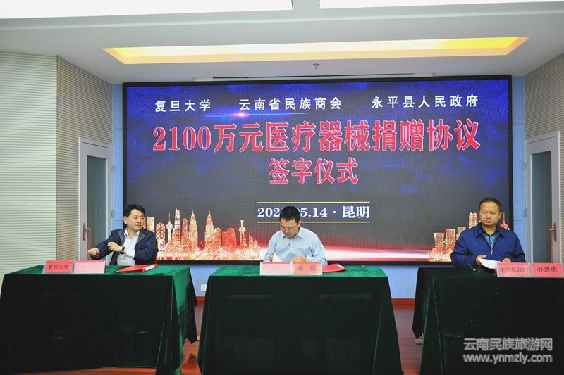 云南民族旅游網(wǎng)訊(記者 吳敏昆)近日,云南省民族商會和復(fù)旦大學(xué)在昆明舉行聯(lián)合向永平縣人民政府捐贈2100萬元醫(yī)療器械補充協(xié)議簽字儀式。云南省民族商會代理會長楊振、商會監(jiān)事長謝自靈、秘書長王耀,復(fù)旦大學(xué)駐永平縣定點幫扶干部王玨,永平縣衛(wèi)生健康局黨組書記莽建勇出席簽字儀式。