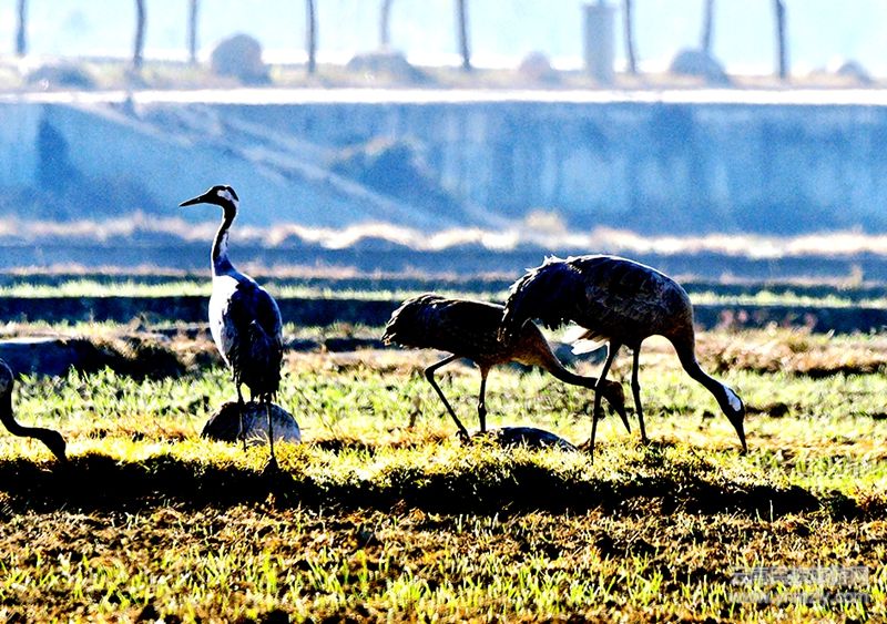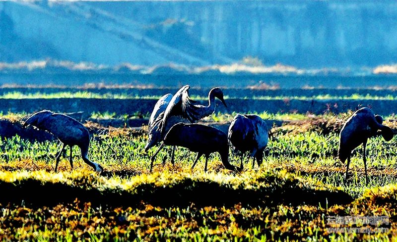 第一次拍到這么漂亮的灰鶴,袁自泰非常地激動(dòng)和自豪,他每天早上都會(huì)去看看它們的生活情況,用相機(jī)定格各個(gè)美麗的瞬間。田野間,灰鶴群們一會(huì)兒在覓食嬉戲,一會(huì)兒從這一塊田飛到那一塊田,一副悠閑自在的樣子。不遠(yuǎn)處,晨跑的人們、出工的車輛來(lái)回穿梭,與田間覓食嬉戲的灰鶴勾勒出一幅人與自然和諧共生的美麗畫卷。
