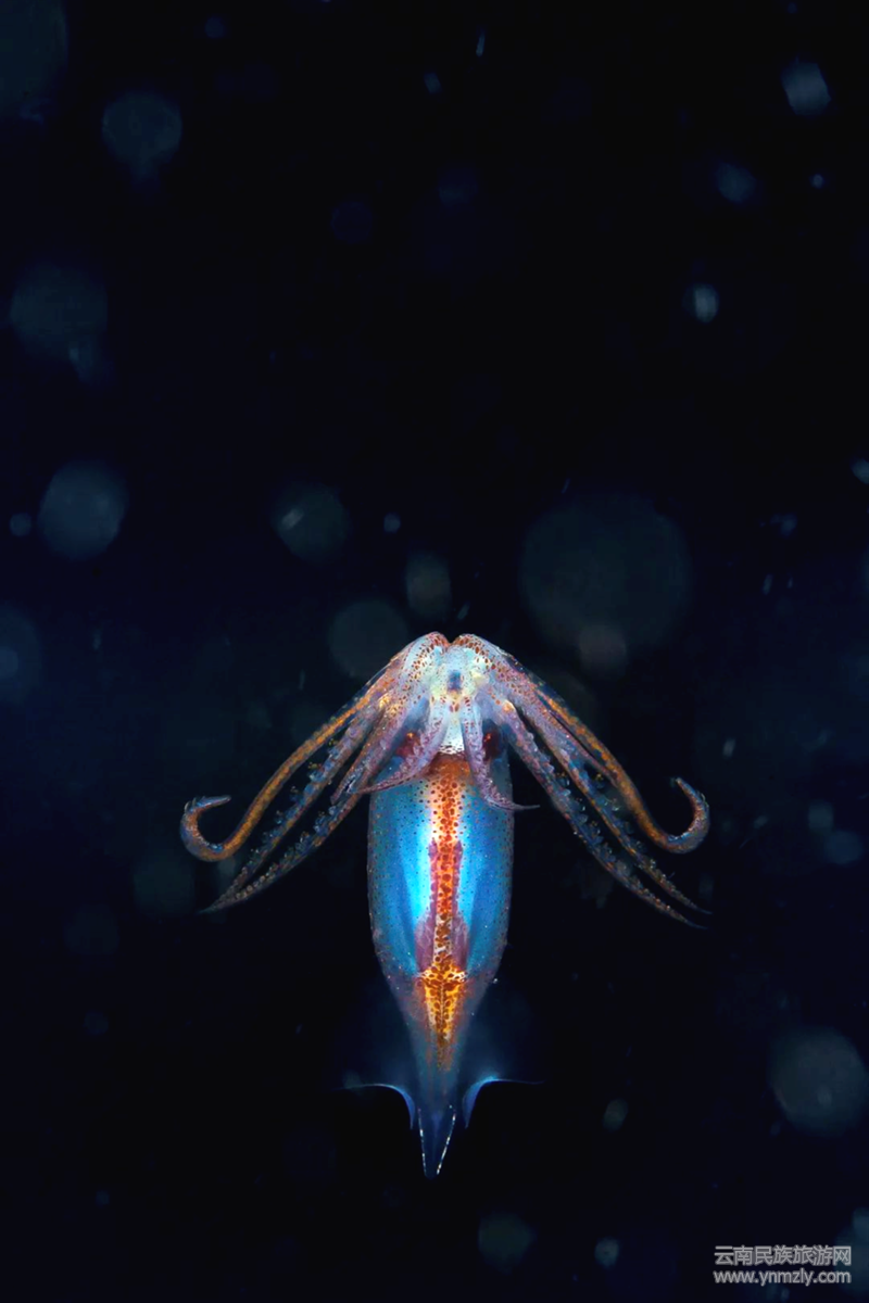 這是一幅如同肖像的作品,在黝暗的深海里,這條筆管魷魚像個(gè)可愛的小生命,面對(duì)著作者的鏡頭,張開的觸須,仿佛在歡迎陌生的客人,又像獨(dú)自在翩翩起舞(見上圖),傳遞給人一種會(huì)心的愉悅。觀眾并不一定都知道它的家族與名稱,但都會(huì)情不自禁地喜歡這個(gè)海底精靈,尤其是孩子,或許會(huì)嚷著要爸爸媽媽把它帶回去,與孩子夢(mèng)里一同嬉戲。
