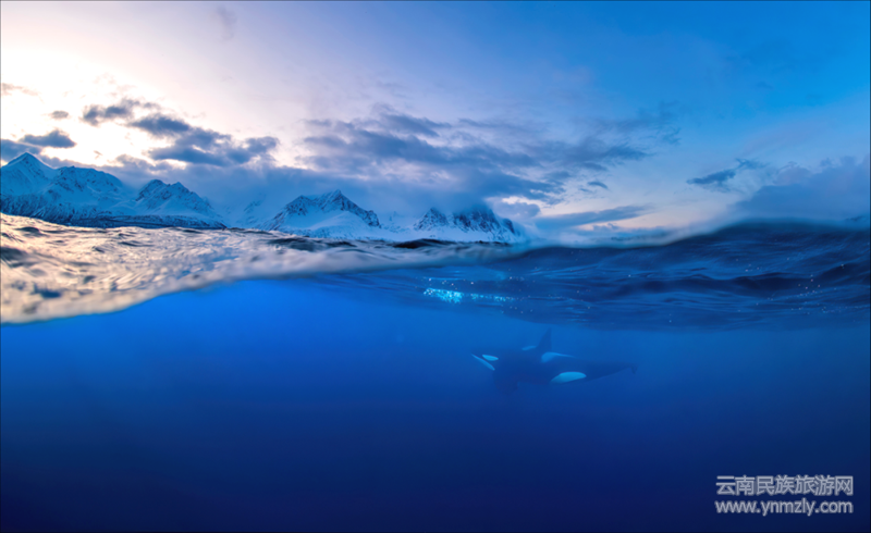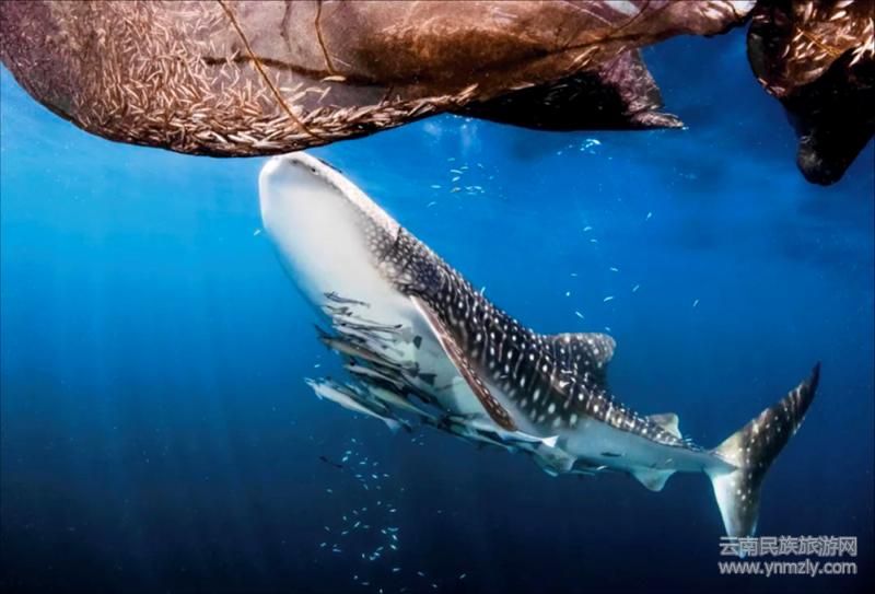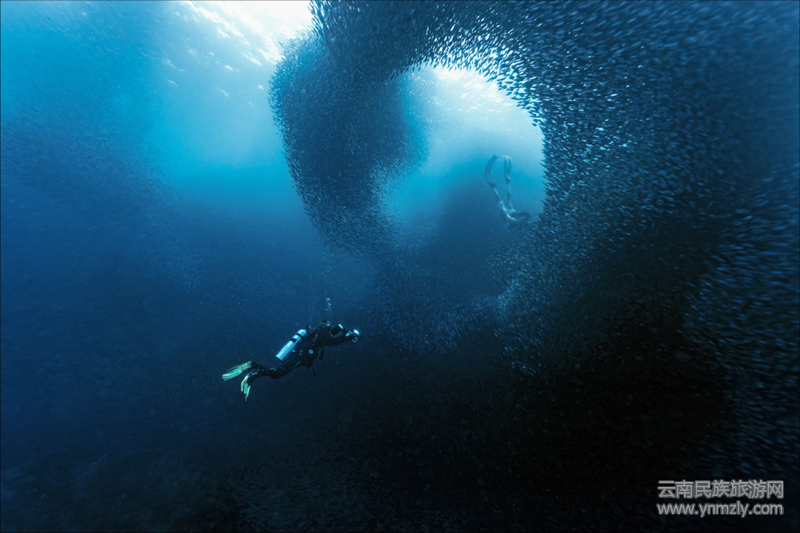 上圖是一幅精心拍攝又極其動(dòng)人的水下攝影,相信有無數(shù)的觀眾為此驚嘆和叫絕。陽(yáng)光投射的水面下,數(shù)以萬(wàn)千的沙丁魚像聽到某種神諭的召喚,簇?fù)矶鴣恚瑖@在美人魚一般的潛水員旁,組成了一幅神奇似乎又不可思議的畫面,猶如一位音樂指揮,奏起了海洋里瑰麗而激蕩的交響樂章;又更像海洋里的一個(gè)童話故事,給人以美的遐想和感染。