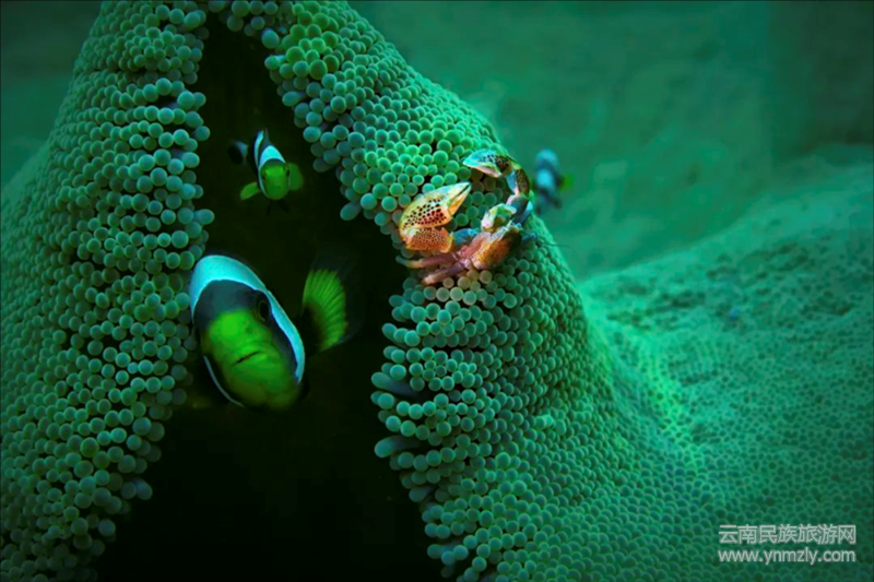 三角洲的秘密 印度尼西亞四王群島,地毯海葵里的小丑魚和瓷蟹。 岳鴻軍2017年攝