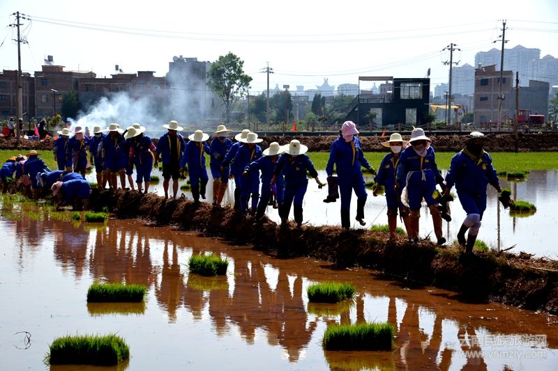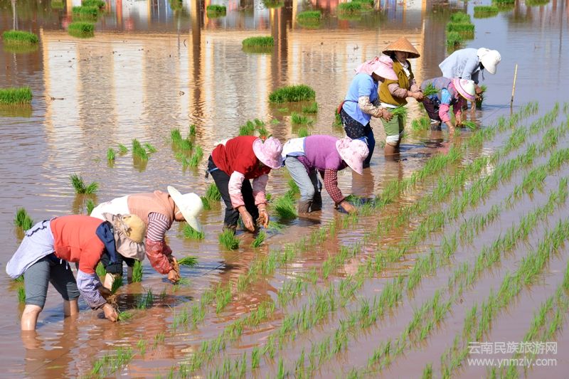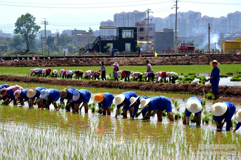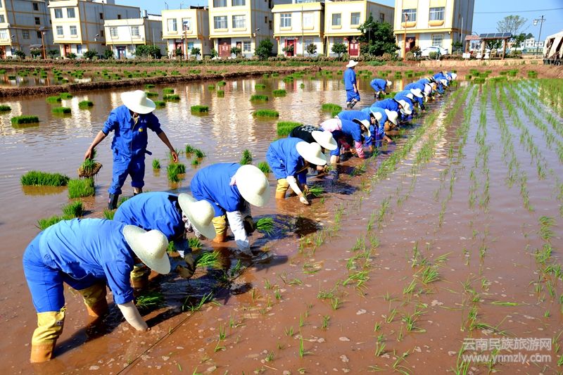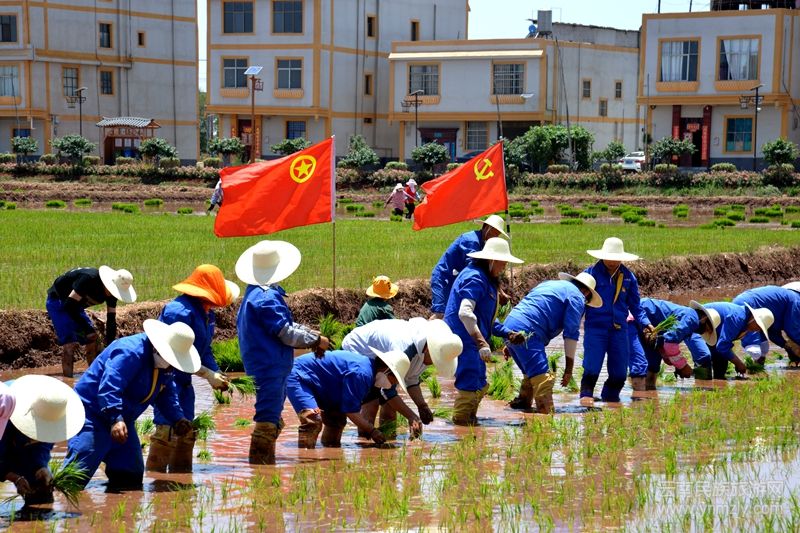 田中正在飛快地插秧的、除當(dāng)?shù)厝罕娡猓€有企業(yè)來支援春耕生產(chǎn)一線為人民服務(wù)的浩坤磷化集團(tuán)的50名團(tuán)員。