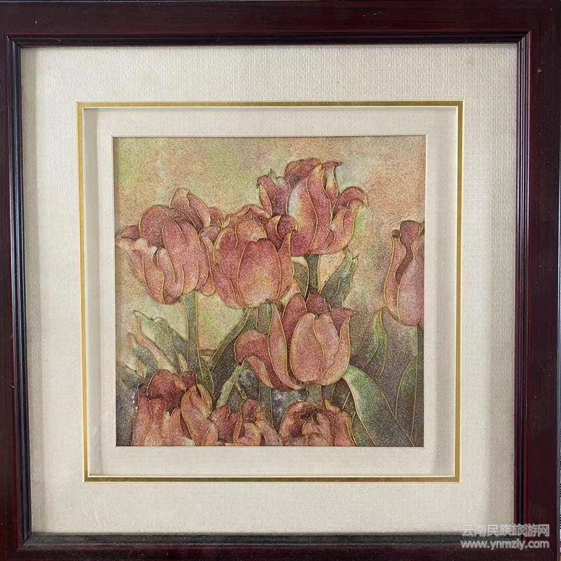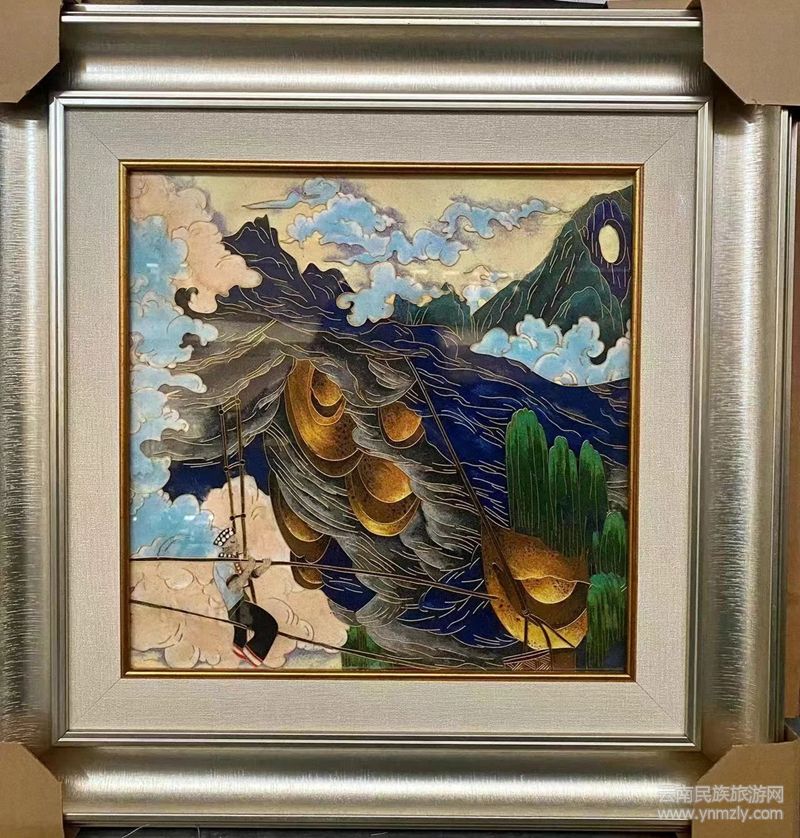 在學(xué)藝和傳承過程中,楊梓藝認(rèn)為,蘭坪有著得天獨(dú)厚的有色金屬資源,這為掐絲琺瑯彩畫提供了最自然而完美的原料。所以,她用蘭坪不同的礦石粉結(jié)合怒江、瀾滄江的沙,并堅(jiān)持將傳統(tǒng)工藝性和繪畫性完美結(jié)合,創(chuàng)作了一大批千年不會(huì)褪色的彩石沙畫。可以說她用指尖“掐”出了家鄉(xiāng)美,也“掐”出了非遺技藝的詩與遠(yuǎn)方,令人贊嘆不已!