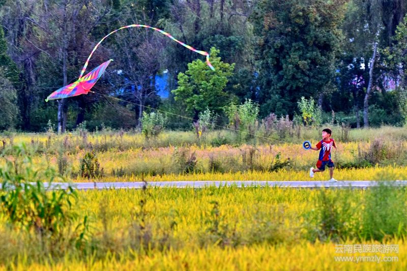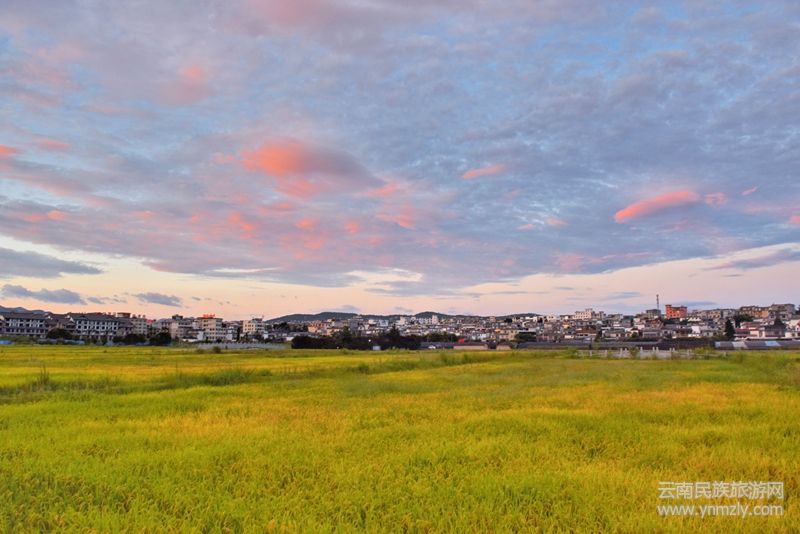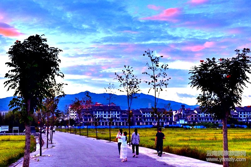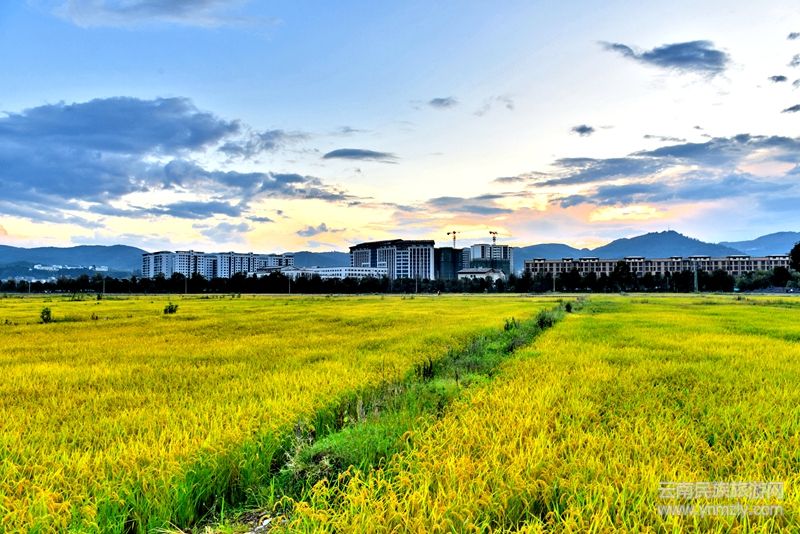 當(dāng)?shù)咎餄u漸披上了“黃金甲”,田園里洋溢著豐收的氣息,太陽也不知不覺醉于其間,緩緩從西邊落下后,余光依然流連于天空,點(diǎn)燃了云朵,直到天幕完全落下,依然用若隱若現(xiàn)的姿態(tài),與漸漸亮起的燈光遙相呼應(yīng)。