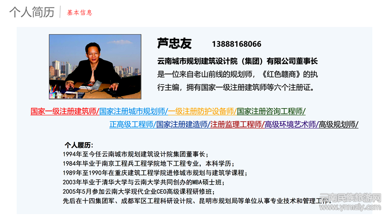 蘆忠友,一名參戰(zhàn)老兵,現(xiàn)任云南城市規(guī)劃建筑設(shè)計院(集團)有限公司董事長,正高級工程師,考取六個國家級證書,并作為云南大學(xué)、云南經(jīng)濟管理學(xué)院客座教授。“葫蘆戰(zhàn)略定位”創(chuàng)始人、葫蘆商學(xué)院院長,曾獲“中國建筑文化杰出貢獻”獎,主導(dǎo)設(shè)計的“拉祜文化廣場”獲得第十六屆人類與民族學(xué)建筑設(shè)計金獎。他利用東方“萬物之始、大道至簡”的智慧,將中華文明“葫蘆文化”與西方的“戰(zhàn)略定位”相結(jié)合,并摸索出本土化、通俗化的“葫蘆戰(zhàn)略定位”。