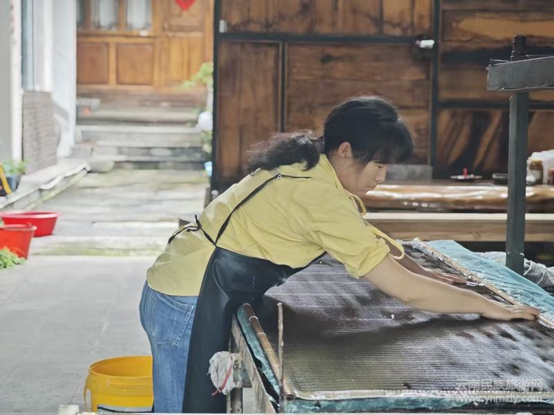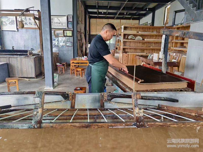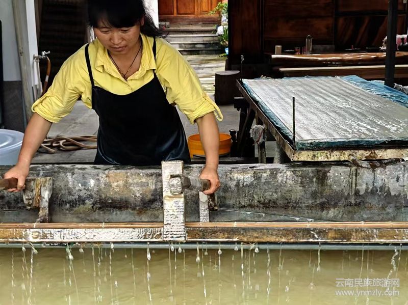 清代以前生產(chǎn)原始,操作笨重,工藝粗糙落后,清寸開泰《騰越鄉(xiāng)土志·物產(chǎn)》條目載:“構(gòu)皮含漿粉,綿而有筋,漚流水中,取出,刮出粗皮,錘析之,再漚,乃以甑蒸,更錘極細(xì),下灰缸泡濫如棉,以竹籮撈起,清水滌蕩,盡去灰質(zhì),碾研米漿,合(構(gòu))棉置缸中,同攪入化,用竹絲簾漾其面,輕提簾起,印板上層累有紙”,曬干成紙。“自購(gòu)構(gòu)而歸迄干成紙,前后手工計(jì)七十余次”,現(xiàn)已簡(jiǎn)化,形成固定的工藝流程,且有不同之處。
