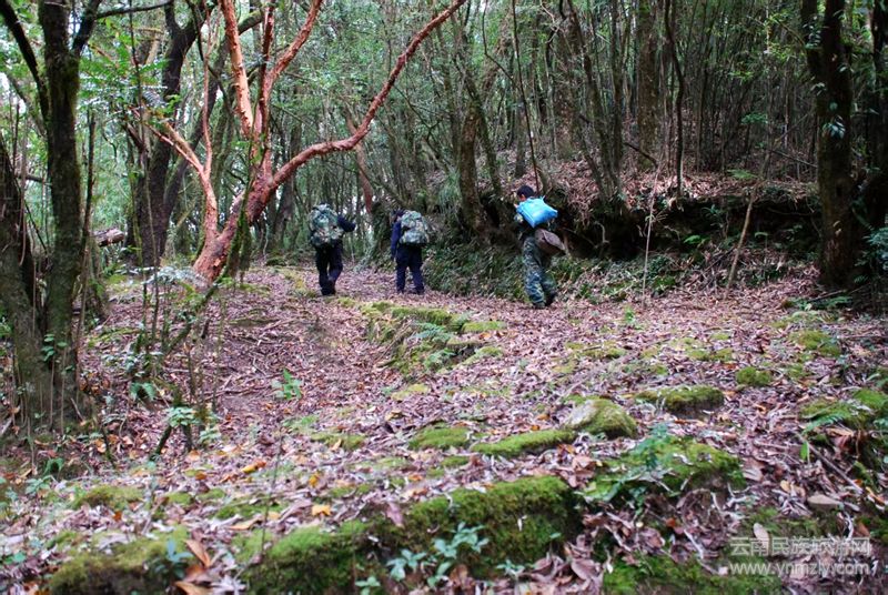 2、南齋公房古道。該古道的開通時間晚于北齋公房古道,相對而言該段古道路徑山勢險峻程度減緩,距離縮短,省時省力。古道位于北齋公房南,山頂有齋公房,故稱之南齋公房古道。該古道東始怒江雙虹橋,西上翻越高黎貢山至界頭壩羅古城。其路徑是: