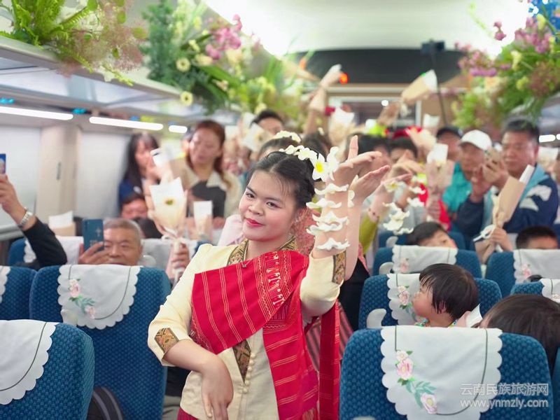 在國(guó)門邊境樞紐——磨憨站,車站通道被巧妙裝點(diǎn)成一條條花團(tuán)錦簇的“幸福長(zhǎng)廊”。身著民族服飾的民族群眾,手持水瓢,以最傳統(tǒng)、最熱情的方式,向過往旅客潑灑出象征吉祥如意的“圣潔之水”。這水,是瀾滄江的浪花凝成的祝福,是熱帶雨林的甘露化作的期盼,車站上的潑水節(jié),將“水水水”(傣語(yǔ)“好好好”)的吉祥話傳遍車站,通過列車和南來(lái)北往的旅客帶向遠(yuǎn)方。