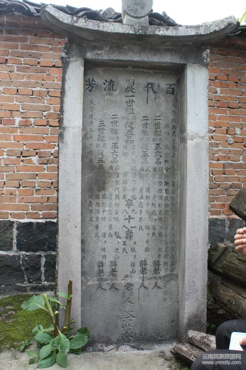 許氏祖塋:位于天成社區(qū)晉家園小區(qū),占地約250㎡,現(xiàn)存墓葬五塚,始修年代不詳,清道光年由后裔合族重修。1997年再次重修一世始祖許斌墓一塚。現(xiàn)存道光記事碑一塊,記載許斌三征麓川的功勛,以及帶兵修筑騰沖石頭城的經(jīng)過,并記錄了恩賜翰林許爾超回鄉(xiāng)祭祖的信息,還記載其陽宅、陰宅同為一地。