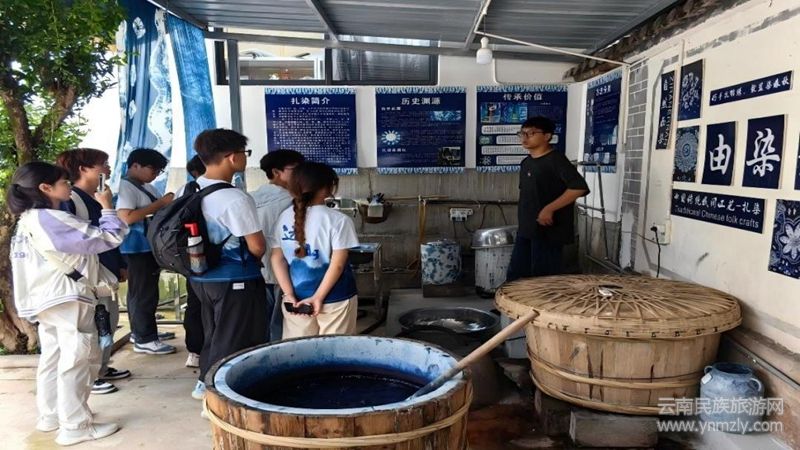 第六站,支教團(tuán)走進(jìn)染香院,沉浸式學(xué)習(xí)白族扎染。在傳承人講解下,了解白族扎染技藝的歷史淵源、文化寓意與工藝智慧。在近距離觀賞精美扎染成品后,成員們?cè)谥笇?dǎo)下嘗試扎結(jié)、捆綁、浸染。當(dāng)親手構(gòu)思的藍(lán)白圖案最終顯現(xiàn),成就感與敬意在成員們心中油然而生。這一過(guò)程不僅是技藝學(xué)習(xí),更是在藍(lán)白染韻的奇妙交織中,完成了一次對(duì)專注、創(chuàng)新與傳承責(zé)任的淳樸匠心。