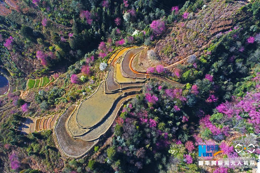 航拍:哈尼山寨櫻花盛開(kāi) 與梯田相映成趣